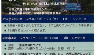 放送大学秋田学習センター主催のジオパーク講演会のお知らせ 12月3日(火)から7日(土)まで、由利本荘市ボートプラザ「アクアパル」にて、「放送大学秋田学習センターさまざま展示会 in ゆりほんじょう」が開催されます。 学生サークルが作成した作品の展示や、最終日には、秋田大学大学院教育学研究科教授の... 2019.11.11 イベント活動情報 詳しく見る