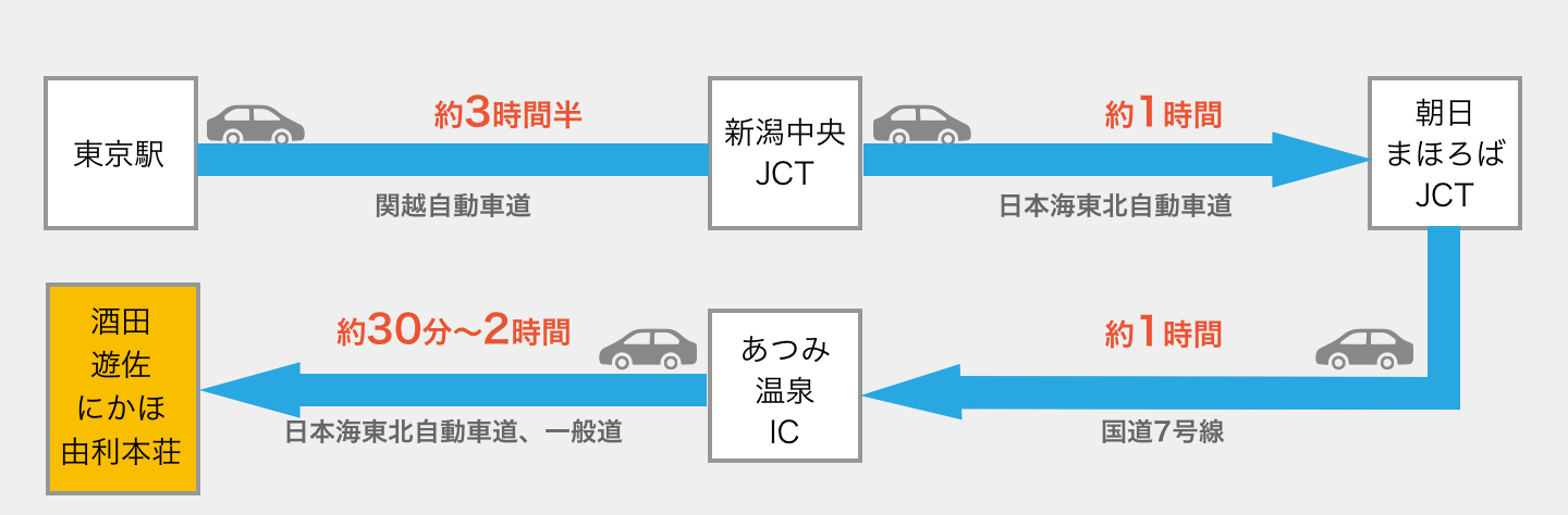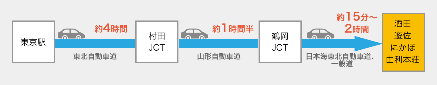 | 高速道路 | 日本海東北自動車道:酒田IC 、象潟IC、本荘IC など |