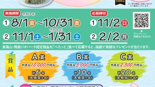 鳥海山・飛島ジオパーク認定商品購入キャンペーンを開催します。 令和7年8月1日(金)から、環鳥海地域連携事業実行委員会主催の鳥海山・飛島ジオパーク認定商品購入キャンペーン「鳥海山・飛島をぺろっと味わおう!」を開催します(共催・一般社団法人 鳥海山・飛島ジオパーク推進協議会)。 鳥海山・飛島ジオパークの... 2025.08.06 イベント 詳しく見る