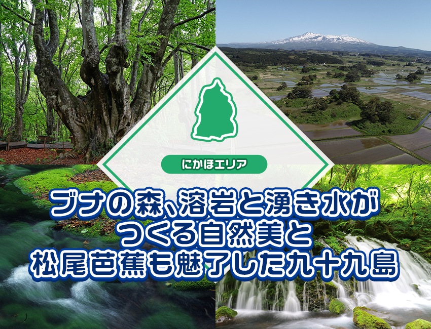 - にかほエリア ブナの森、溶岩と湧き水がつくる自然美と松尾芭蕉も魅了した九十九島