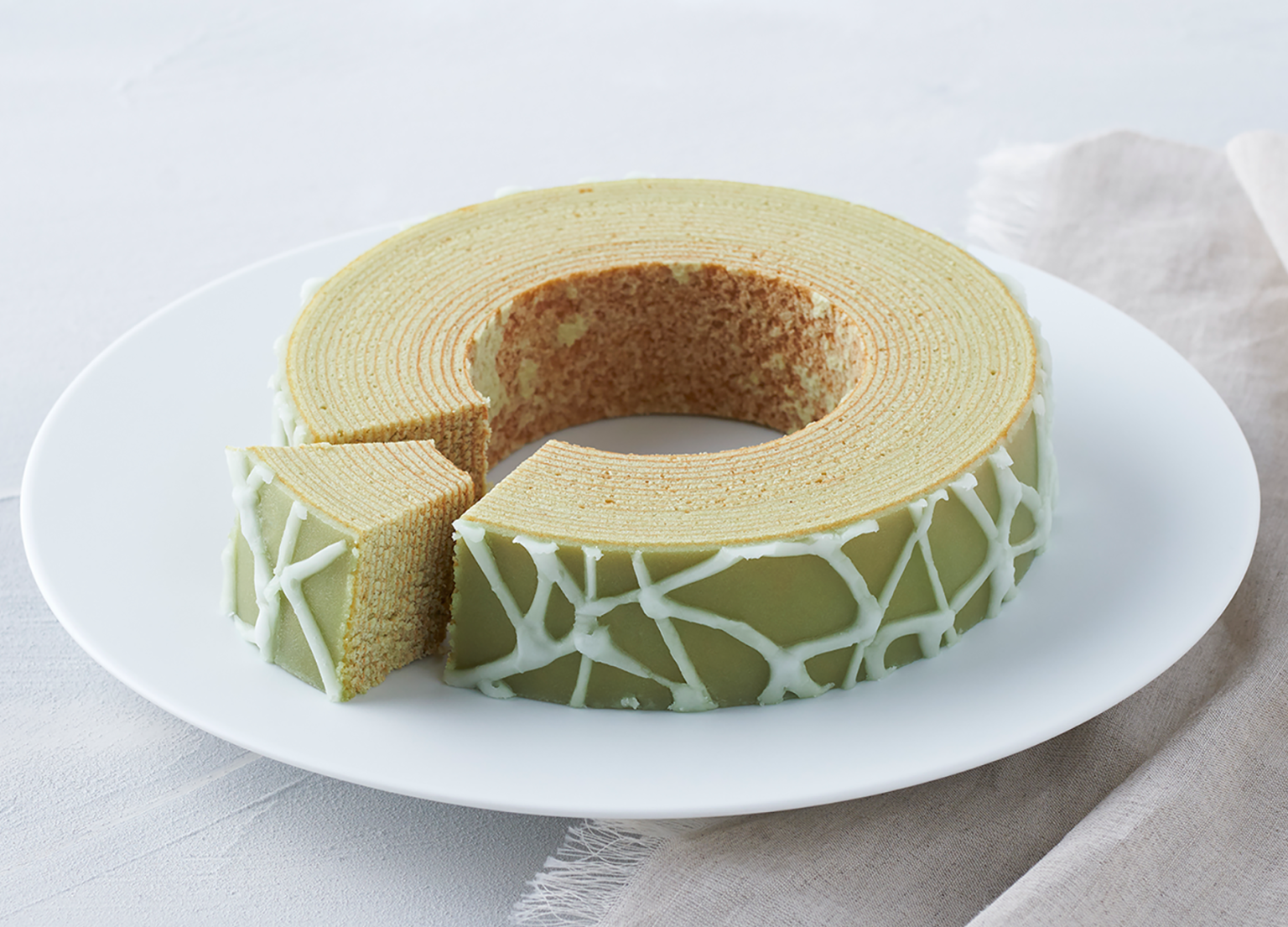 庄内平野で生産された米粉100%の生地に、酒田市特産の庄内砂丘メロンの果実を加え、芳醇な味わいとしっとりした食感に焼き上げたバームクーヘンです。周りもメロンの網目模様を表現し、見た目にも工夫した商品となっています。