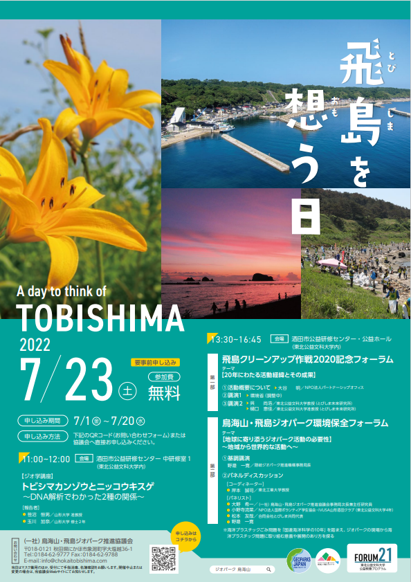 その飛島に生息する花「トビシマカンゾウ」のDNA解析による調査報告、また、飛島クリーンアップ活動が始まってから20年を記念し、活動経緯とその成果の発表やジオパーク活動の観点から環境保全についてのフォーラムを開催します。