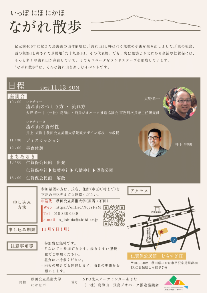 流れ山という地形を学び、にかほの暮らしをもっと楽しむヒントが得られるような一日、ぜひご参加ください。