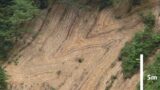 山頂部では垂直方向に節理が発達し、東西方向には最大幅10数m、長さ約100mの割れ目があります。